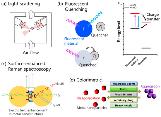 Optical technologies for chemical detection. (a) Dust detector. (b) Fluorescence quenching-based chemical detection technology. (c) Surface-enhanced Raman spectroscopy. (d) Metal nanoparticle aggregation-based colorimetric sensing technology.