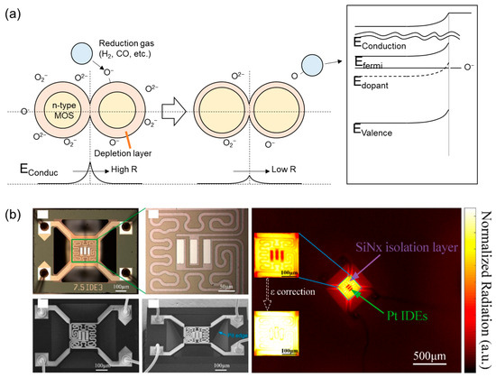 (a) A schematic drawing of the working mechanism for a n-type MOS gas sensor. (b) Images of MEMS device and the thermographic camera image [69]. Copyright 2021 by Chen et al.