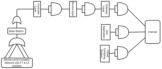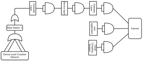The crossbar network is replaced by a single device, which is assigned the crossbar network fault rate, thus creating the linearized hierarchical fault tolerance analysis model. Table 5 shows the calculation of the fault rate of the modified and adjusted IoT model. The table shows the computational details, which show the precedence relationships among the devices and carry the success rate based on the OR/AND relationship.