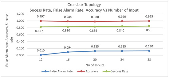 The success rate computations for IoT implemented with crossbar topology and Firmware are shown in Table 5. Figure 9, Figure 10 and Figure 11 show the variation in the success rate, false alarm rate, and accuracy as the number of inputs changes. The figures show that as the number of inputs increases, the success rate, the false alarm rate, and the precision increase. In contrast, the Success Rate and Accuracy improve, and the false alarm rate increases due to increased input.