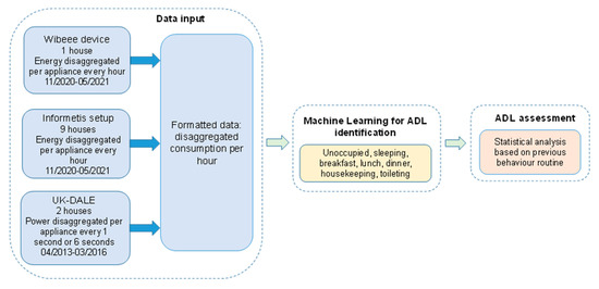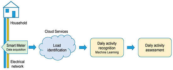 Figure 2. For that purpose, the activation of some appliances is associated with the corresponding activities. Once a daily activity is detected, a second stage carries out its assessment, based on comparing its performance with three general parameters derived from the training period: start time, duration and previous activity. This comparison is carried out from a statistical point of view, and it allows a score to be provided for each activity every day. The proposal also presents some drawbacks that should be mentioned at this point. Firstly, the electrical consumption is a limited source of information for inferring behaviour patterns, since only those appliances with high consumption are clearly identified in most common solutions with NILM techniques. This implies that those routines related to low-power devices, such as leisure, are more difficult to monitor, actually constraining the amount of information that may be derived from smart meters. Furthermore, the use of some appliances might be associated to some daily activities, such as eating. Nevertheless, these appliances only ensure the action of food preparation, but not eating itself. This may become a significant drawback for some people with mild cognitive impairment. The last disadvantage to take into account is privacy. Although smart meters are minimally invasive devices compared to other sensory systems such as cameras or microphones, they also collect sensitive data related to the energy habits of a household. In that way, data must be collected, anonymized and treated according to the corresponding regulations, depending on the territory (GDPR, General Data Protection Regulation, in the case of the European Union).