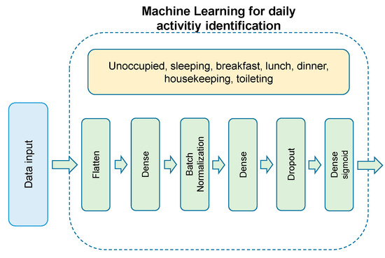Figure 3, it consists of two fully-connected layers; flatten, batch normalization and dropout layers; and a final classification layer. Seven different daily activities have been included in this study: sleeping, breakfast, lunch, dinner, housekeeping, toileting and unoccupied. For that purpose, a relationship among activities, appliances and times was assumed, as depicted in