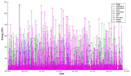 At this point, it should be noted that the understanding of daily activities detected hereinafter may become more complex due to the fact that there are four people living in the house. In this context, the derived activities refer to the general behaviour patterns of the household; i.e., the sleeping activity will imply that all four are likely in bed, and there is no energy consumption in the house, apart from those appliances allowed to run during the night time, such as the washing machine or the dishwasher. Furthermore, the activities breakfast, lunch and dinner are actually activated when the corresponding appliances are used to prepare/cook/warm up the food; therefore, they do not imply eating that meal at that moment (this a limitation in this kind of monitoring system based on energy consumption). Besides, as can be observed in
