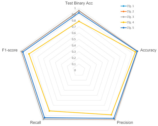 The most suitable structure for the deep neural network in charge of identifying the daily activities was selected from among the previous configurations, in terms of the classification metrics and the computational load. This configuration is no. 2: Dense (512, relu) + Batch Normalization + Dense (256, relu) + Dropout (0.25) + Dense (7, sigmoid). The network has 142.343 trainable parameters. Nevertheless, it is worth mentioning that most of the studied configurations present a similar performance.
