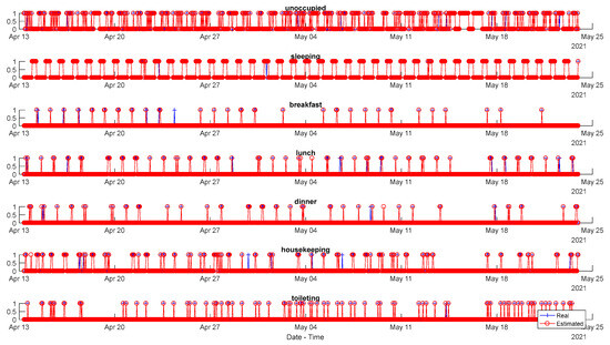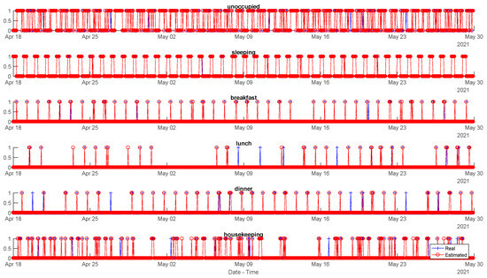 Figure 6 depicts the identified daily activities, as well as those actually defined in the available ground-truth, for the case of the Wibeee meter deployed in the house (with two adults and two teenagers) during the test period from 13 April 2021 to 23 May 2021. It is possible to observe how some activities, such as sleeping, breakfast, lunch or dinner, are quite regular, and properly identified during this time, even though the proposal missed some isolated activities in a reduced number of cases. On the other hand, housekeeping and toileting are not so regular: in the case of toileting, this is likely due to the fact that it is associated only with the use of a hair dryer, which is not employed very often. For clarity’s sake,