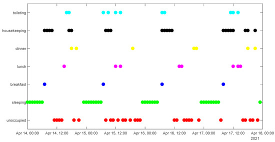 Figure 7 depicts a shorter representation of the identified activities for only four days: as an example, it is possible to check that sleeping, breakfast and housekeeping (mainly in the morning) are quite regular in these four days. On the other hand, lunch and dinner are more variable, since the four people present different routines during the day due to the work and school timetables.