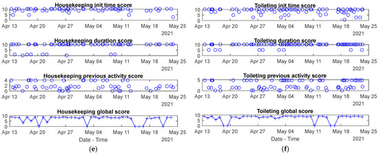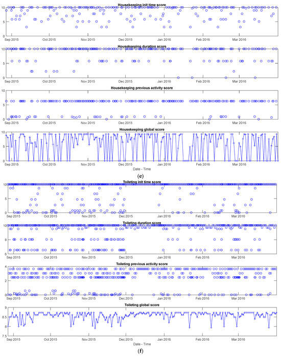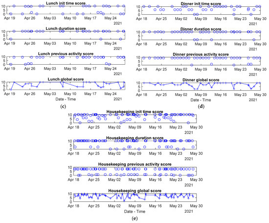 Figure 8. Breakfast seems to have lower scores than the others, since the start time and duration of this meal change a lot during the weekends depending on the waking-up time. On the other hand, the previous activity to breakfast and lunch is not so fixed, and this partial score often results in low values, no matter the day of the week, whereas dinner appears in a more fixed routine (commonly after housekeeping or unoccupied).