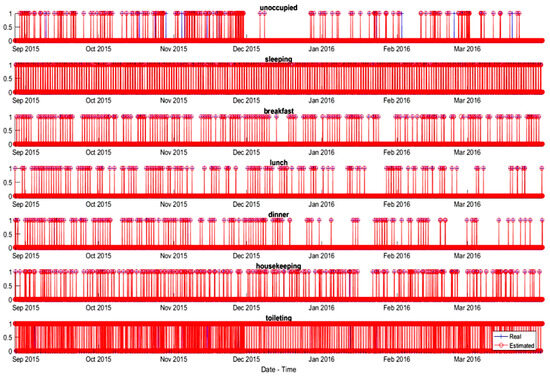 Finally, the activities Sleeping and Unoccupied are discriminated on the basis of the time interval, since the lack of usage of the involved appliances is the same for both. In the case of Sleeping, only the appliances that imply an immediate handling by the tenant are considered, and some, such as the washing machine or the dishwasher, are discarded, since their operation cycles are much longer and their consumption only means an interaction with the tenant at the beginning of the cycle.