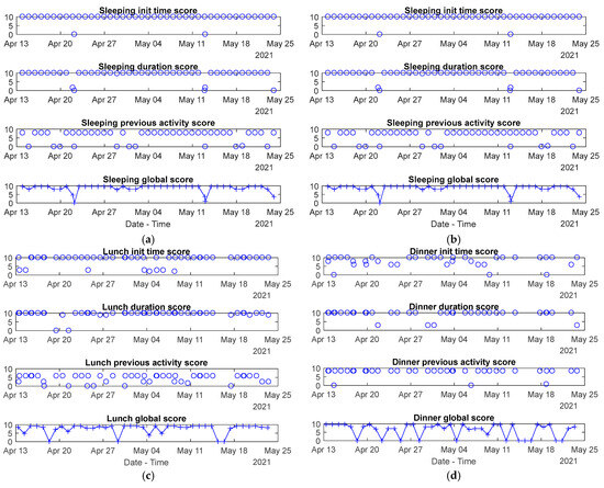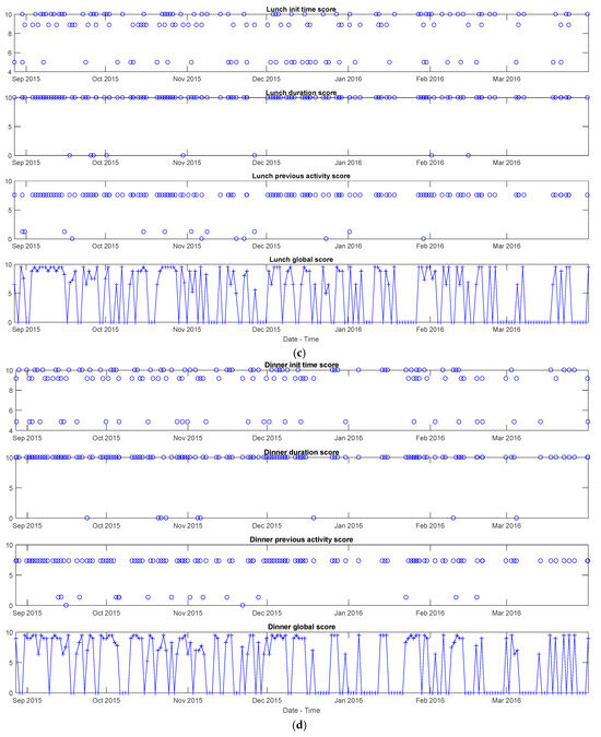 A similar analysis can be carried out with data from the houses monitored by Informetis equipment. For clarity’s sake, only house no. 1 is depicted here in detail (with four adult tenants). Figure 9 plots the identified daily activities, as well as those actually defined in the available ground-truth. Note that the Informetis solution does not provide information about any appliance involved in the toileting activity (there is no hair dryer as before), so this activity cannot be monitored. It can be observed in Figure 9 how this house is quite regular in some activities, such as sleeping, breakfast and dinner. Indeed, only one breakfast is missing on 14 May, but on that date it is also possible to observe a variation in Sleeping, probably due to an earlier breakfast. Dinner also is quite regular, with long periods of that meal taking place at the same interval. Nevertheless, lunch seems to be a variable, many times happening out of the house during the working days of the week. These features are reflected in Figure 10, where these activities are assessed. As expected, lunch presents lower scores than the others. As for the sleeping activity, it can be checked in Figure 10a how some nights seem to behave differently, achieving a low score, due to unusual power consumptions in the middle of the night. In Figure 10b, breakfast performs in a regular way, although it presents certain variability with respect to the previous activity. Lunch in Figure 10c is more chaotic, and it is even missing on some days, probably because the tenants were having lunch outside the household. Finally, housekeeping is also variable on a daily basis, although this aspect is not so relevant, since these chores are often carried out over a week. In this way, Figure 10e allows for confirming substantial activity about housekeeping over successive weeks.