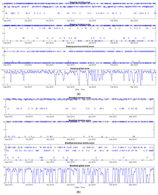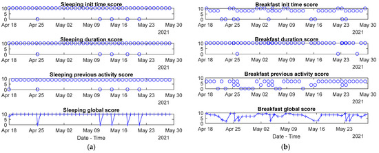 These identified activities were assessed by following the method described before in Equations (1) and (2), comparing them with the patterns learnt during the training period. Figure 8 shows the resulting evaluation for six activities: sleeping, breakfast, lunch, dinner, housekeeping and toileting. Every activity presents three partial scores, , and in Figure 8, corresponding to the three evaluated aspects (start time, duration, and previous activity), and the final weighted score . It is possible to observe how daily activities apparently perform worse during the weekends, including sleeping, mainly due to the more flexible schedules followed by this family, out from the routines existing in the working days. Indeed, as was mentioned before, all the activities were poorly scored during the weekend 15th–16th May, since the house was empty during those days. The three meals, breakfast, lunch and dinner, are quite regular, and properly detected in most cases, when they take place, which implies that they often provide high scores, as shown in Figure 8. Breakfast seems to have lower scores than the others, since the start time and duration of this meal change a lot during the weekends depending on the waking-up time. On the other hand, the previous activity to breakfast and lunch is not so fixed, and this partial score often results in low values, no matter the day of the week, whereas dinner appears in a more fixed routine (commonly after housekeeping or unoccupied).