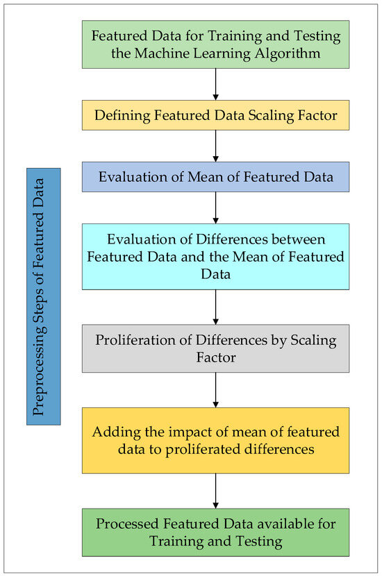 Steps for preprocessing featured data employed in the machine learning algorithm.