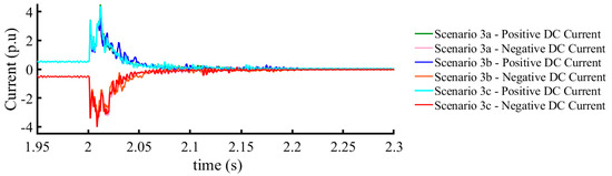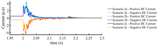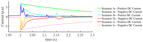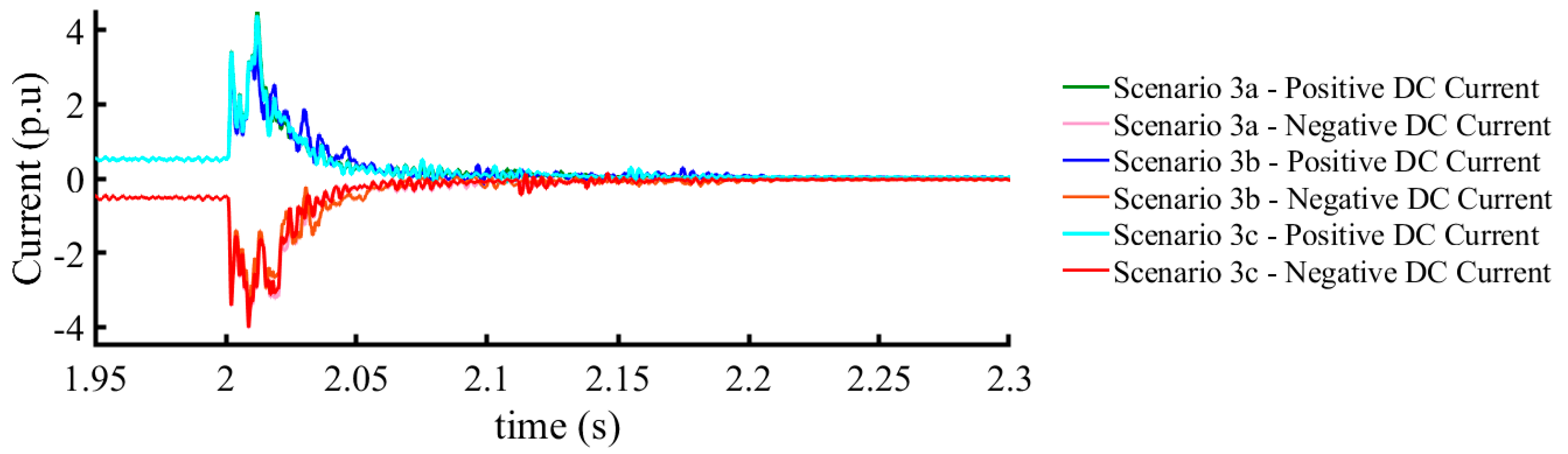 A pole-to-pole ground fault was applied at a test system line L1, 200 km from the converter station. DCs were measured for the fault at different levels of fault resistance and ground resistance, as shown in Figure 7, to understand how machine learning-based fault diagnostics behave.
