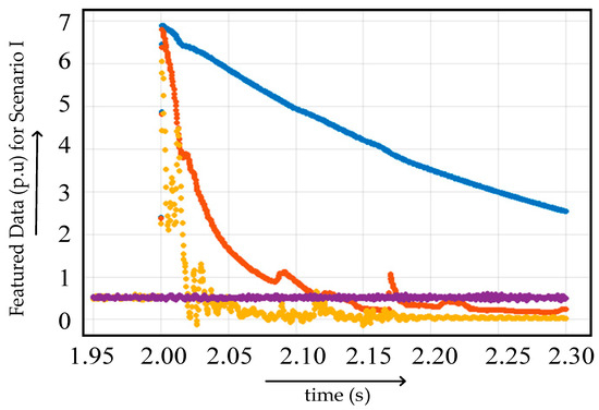 Featured data derived from the current data measured at different fault locations in fault scenario 1.