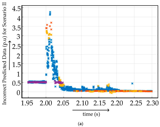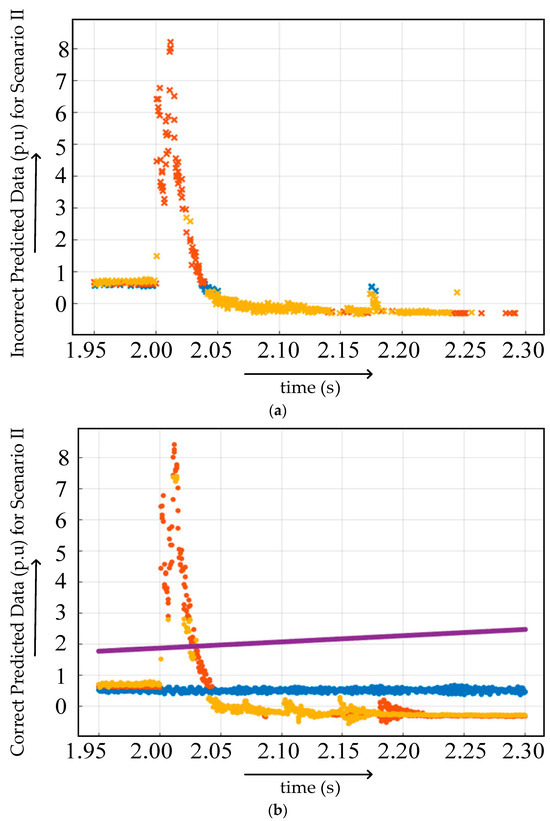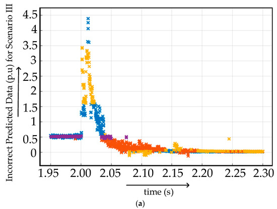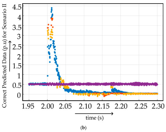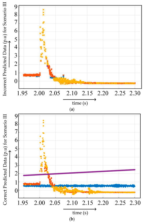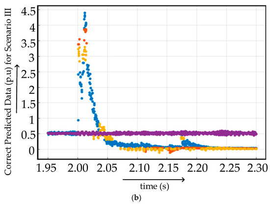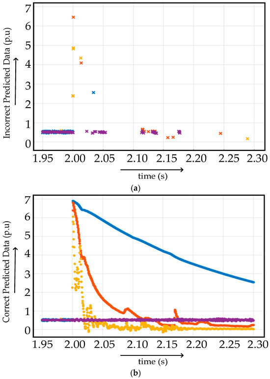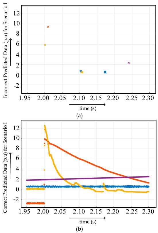(a) Incorrect and (b) correct predicted data at different fault locations in fault scenario 3.