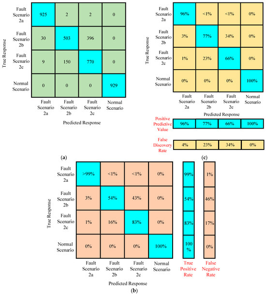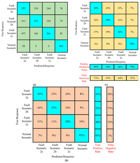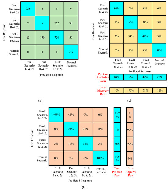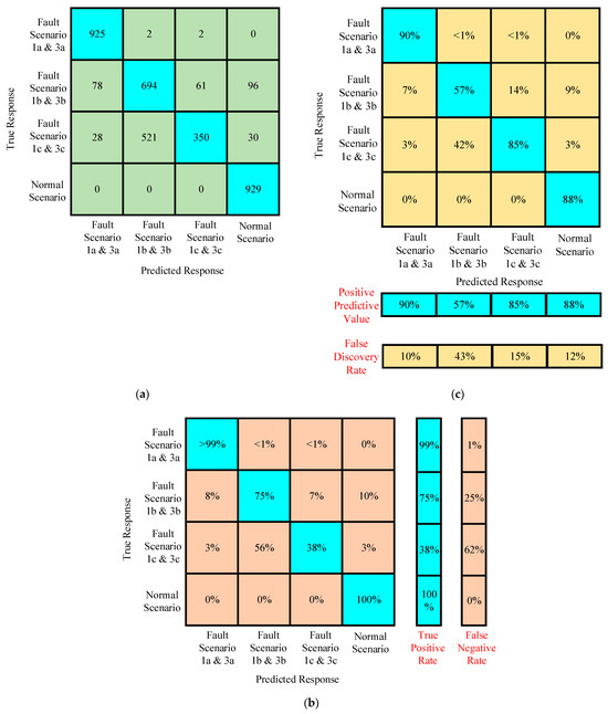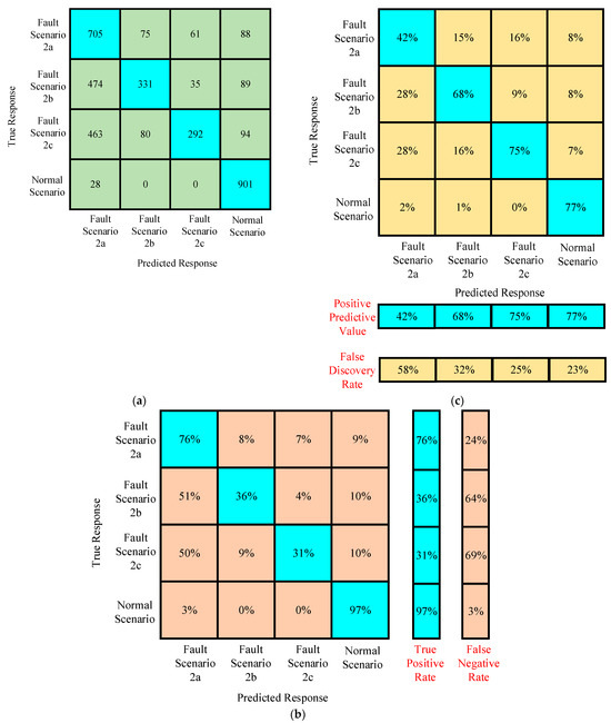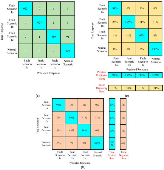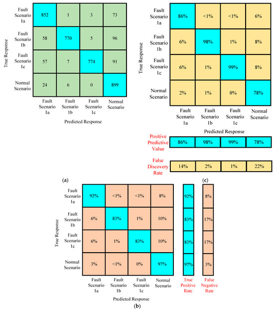 The accuracy of the predicted response against the true response was higher than 99% in the case of normal and fault scenarios (1a and 2a), as shown in Figure 33a. The true positive rate was greater than 99% under the normal scenario and fault scenario (1a and 2a), as shown in Figure 33b. Hence, the proposed algorithm performed well in the case of distinct and different characteristics, such as in normal scenarios and fault scenarios (1a and 2a). The higher false negative rate depicts the poor classification among faults with relatively high fault and ground resistances, resulting in raising the limitation of the proposed algorithm, even with the preprocessed featured data. The positive predictive value reduced to 88% for normal scenarios and 90% for fault scenarios (1a and 2a) with preprocessed featured data. The improved accuracy, as compared to testing without preprocessed featured data, highlights the benefits of using the proposed simplified machine learning algorithm, as shown in Figure 33c.