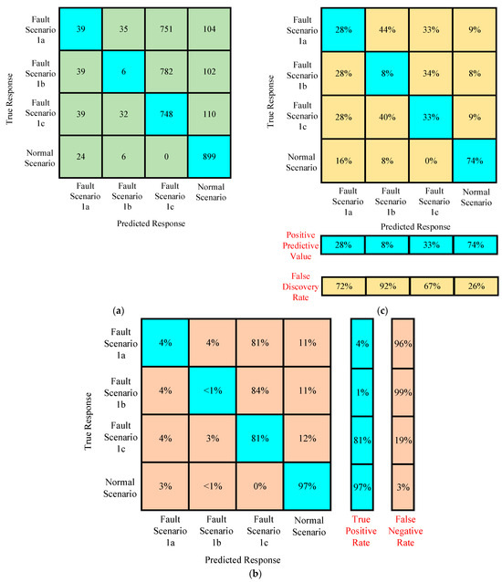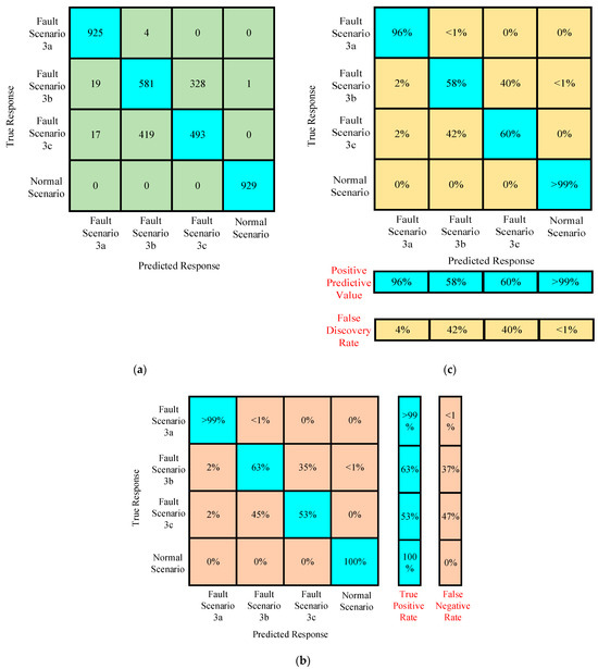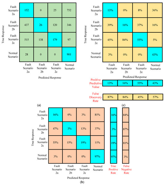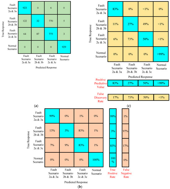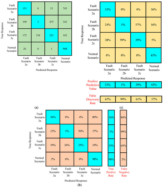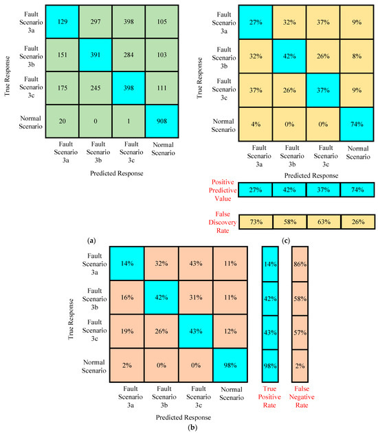 It was found that accuracy does not affect the predicted response against the true response in the normal scenario, as shown in Figure 29a. The true positive rate was 100% under normal scenarios, even for the new preprocessed featured data, as given in Figure 29b. Hence, the proposed algorithm performed well under testing with the new data, particularly in the case of distinct and different characteristics, as in normal scenarios in comparison to fault scenarios. The higher false negative rate is observed in only one fault scenario among all the normal and fault scenarios, as shown in Figure 29c. The positive predictive value is higher in three scenarios under testing, with the new preprocessed featured data resulting in adaptability and certainty in more than 75% of scenarios of fault identification and classification with this simplest proposed algorithm, as shown in Figure 29c.