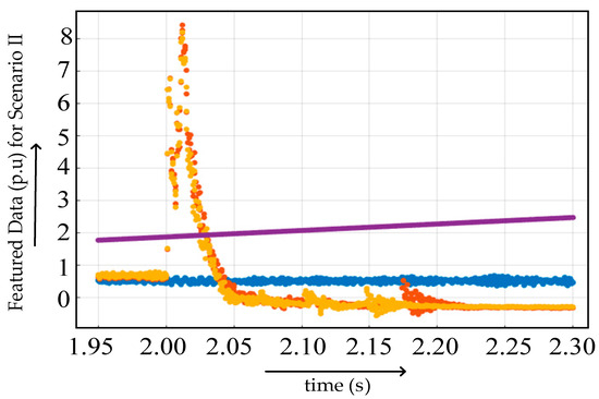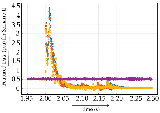 Featured data derived from the current data measured at different fault locations in fault scenario 2.