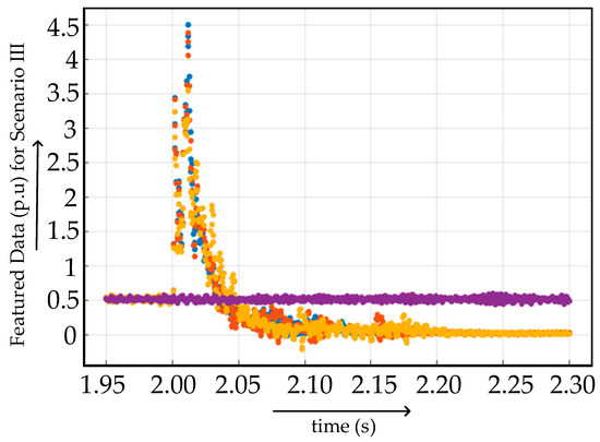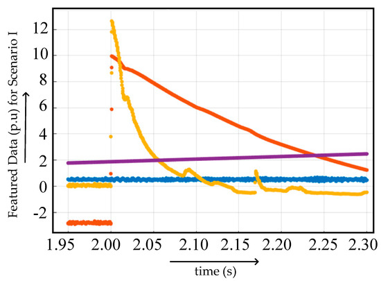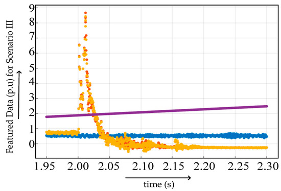 In case I, scenario 1, as mentioned in Table 3, is used for the training of the proposed algorithm. The graphical representation of featured data for case I is given in Figure 8. Based on the training of data on a medium tree-based classification algorithm, it is found that accuracy up to about 88.7% is attained with 40 splits in medium tree. The graph of correct and incorrect predicted data obtained after medium tree-based classification is given in Figure 9. The dot represents that the prediction is successful and the cross represents the unsuccessful prediction, resulting in the reduction in accuracy. Blue line dots/crosses indicate the scenario 1a (FR = 0.001 Ω and GR = 0.1 Ω), orange line dots/crosses indicate the scenario 1b (FR = 0.1 Ω and GR = 1 Ω), pale yellow line dots/crosses indicate scenario 1c (FR = 1 Ω and GR = 100 Ω) and purple line dots/crosses indicate normal scenario for Figure 8 and Figure 9, as mentioned in Table 4.
