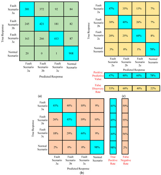 (a–c) Confusion matrices of the trained algorithm for assessing the performance under testing with the newly featured preprocessed data of scenario 1 and scenario 3.