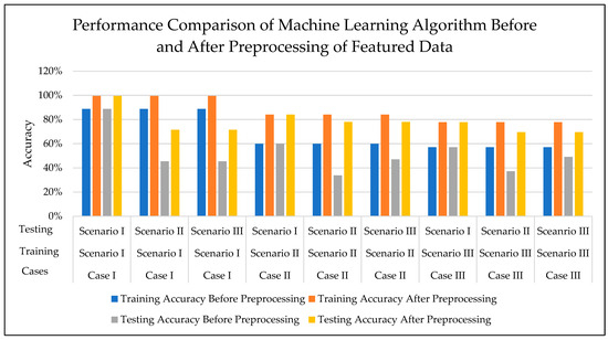It is observed that the preprocessed featured data not only increased the accuracy of training, but also testing with new featured data, resulting in increasing the application of the proposed machine learning algorithm. Figure 34 elaborates the performance comparison of machine learning algorithms trained and tested with and without preprocessed featured data.