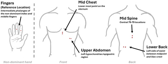 EDA was simultaneously acquired using a set of commercially available wearable devices (Shimmer3+ GSR Unit, Shimmer, Dublin Ireland). Signals were sampled at 120 Hz while a proprietary laboratory-developed application was used to collect, synchronize, and monitor the recordings. Self-adhesive, ConMed gel-based Ag/AgCl electrodes (CONMED Corp. Largo, FL, USA) were placed on five different locations across the body including the fingers (index and middle fingers of non-dominant hand), mid-chest, upper abdomen, lower back, and mid-back as illustrated in Figure 1. Each area was cleaned with 70% isopropyl alcohol (Vi-Jon Laboratories, St. Louis, MO, USA) prior to placing the electrodes and shaved if necessary. The orientation and distance of the electrodes were kept fixed for all participants. The Shimmer devices were secured to the body near the respective electrodes using medical tape. Any loose wires were secured with tape as well to reduce the noise induced by abrasion with clothing/movement.