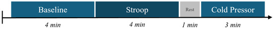 The experiment was divided into three phases, which were completed as the subject sat upright in a stationary chair. The subject was required to ensure that their back was not in contact with any part of the chair while sitting as still as possible to prevent undesirable motion artifacts. The initial Baseline phase comprised a four-minute period during which the participants were instructed to silently relax with their eyes open. The second phase, the Stroop task, consisted of a four-minute Stroop task that the participants completed on a tablet suspended in front of them immediately following the baseline. Four minutes was determined as a reasonable time window to elicit an EDA response as responses have been seen in as little as 40–120 s [18,20]. They were instructed to vocally indicate the color in which the text on the screen was written. The third phase, the Cold Pressor task, required the participants to submerge their dominant hand in an ice-cold reservoir maintained at a temperature of 4 °C for a minimum duration of three minutes. A 60 s break separated the Stroop from the Cold Pressor to let the subject rest and allow time to position the necessary ice water bath. Following the completion of all three phases, the recordings were concluded. A summary of the protocol is displayed in Figure 2.