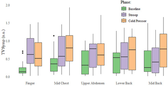 Table 1 contains the metrics derived for the study participants across all protocol phases and locations. The EDA signals from the fingers, i.e., reference location, exhibited statistically significant differences in the NS.SCR count between the baseline (M = 57.08, SD = 21.28) and Stroop phases (M = 75.098, SD = 16.82) (p < 0.05). This statistical significance is not replicated in any of the test locations on the torso for NS.SCRs. The TVSymp recorded from the fingers also showed significant differences in mean TVSymp values between the baseline (M = 0.255, SD = 0.24) and both the Stroop (M = 0.813, SD = 0.45, p < 0.02) and Cold Pressor (M = 0.737, SD = 0.43, p < 0.02) phases. TVSymp derived from the mid-chest location also demonstrates sensitive detection of the three test phases in Figure 2, showing significant difference in average TVSymp between baseline (M = 0.394, SD = 0.37) and Cold Pressor (M = 0.878, SD = 0.61) (p < 0.01) phases. Similar trends amongst the metrics, albeit not significant, are visualized in Figure 3 across other torso locations. Within mean SCL, the fingers, upper abdomen, and lower back all showed sequential increases across the protocol while the mid-chest and mid-back decreased for the Stroop task. Regarding NS.SCRs, signals recorded from the torso locations exhibited different trends as compared to the fingers, which showed a decreased activity after an initial increase during the Stroop task. On average, TVSymp from the fingers increased from the baseline phase to the Stroop task but decreased during the Cold Pressor while the rest of the locations showed sequential increases across the protocol timeline, again visible in Figure 3.