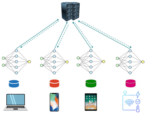 - McMahan, B.; Moore, E.; Ramage, D.; Hampson, S.; y Arcas, B.A. Communication-efficient learning of deep networks from decentralized data. In Proceedings of the Artificial Intelligence and Statistics, Fort Lauderdale, FL, USA, 20–22 April 2017; PMLR: Cambridge MA, USA, 2017; pp. 1273–1282. [Google Scholar]