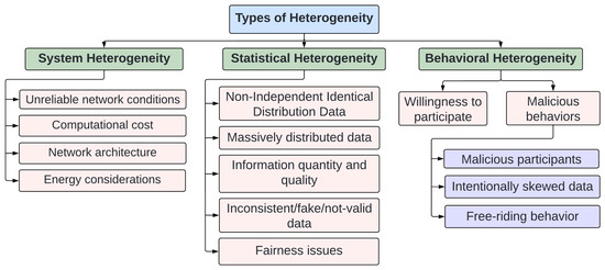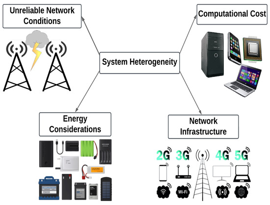 The following sections provide a detailed analysis of each heterogeneity category. First, we examine system/architectural/device heterogeneity, which arises from differences in hardware capabilities and network conditions. Some devices may have limited energy availability, as seen in Internet of Things (IoT) scenarios, while others may struggle to connect to the aggregator due to low coverage or network congestion.