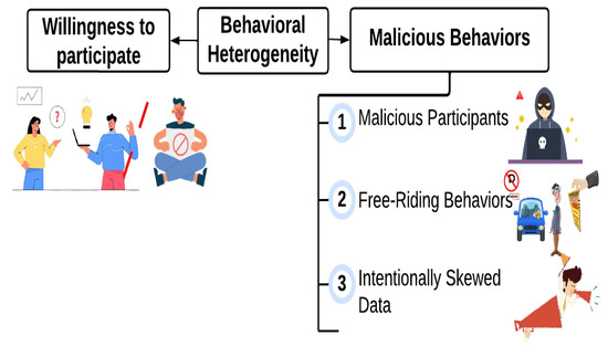 Despite these advances, behavioral heterogeneity has remained a relatively underexplored dimension in FL research. While the existing literature discusses challenges such as unreliable network conditions and non-uniform computing resources, there has been a limited emphasis on the human-driven factors influencing FL performance. Behavioral heterogeneity encompasses critical issues such as client participation willingness, incentive mechanisms, reputation-based aggregation, and adversarial behaviors—all of which directly impact model reliability and fairness [8,9].