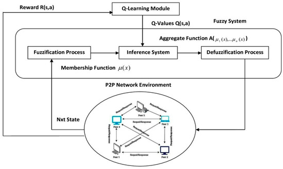 | The integration of FLP and Q learning combines the advantages of handling uncertainty with fuzzy logic and the learning capability of reinforcement learning for optimized peer selection in P2P networks. , discount factor . Output: Optimized peer selection set for P2P networks.
