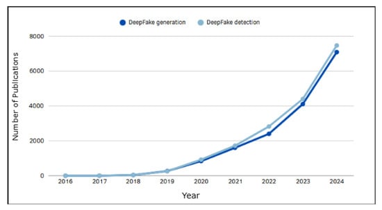 “I only believe what I see.” This statement reflects a widespread cognitive bias that equates visual evidence with truthfulness [1]. This reliance on visual authenticity has been deeply ingrained into human perception; however, recent advancements in deep learning like AlexNet [2] have disrupted this paradigm. The rise of deepfake technologies has enabled the creation of hyper-realistic manipulated media, challenging the very foundation of trust in visual evidence [3,4]. Deepfakes leverage Artificial Intelligence (AI) to alter or replace facial identities in images and videos, often generating results that are indistinguishable from reality. Generative AI models, including Generative Adversarial Networks (GANs) [5] and diffusion-based frameworks like Stable Diffusion [6], have revolutionized synthetic media creation by generating highly realistic content. While these advancements drive innovation, they also pose societal risks such as misinformation, identity theft, and fraud, making the detection of manipulated media a pressing research challenge. According to the Dimensions Scholarly Database [7], the rapid advancement of deepfake generation technologies, along with the corresponding rise in detection research, underscores an ongoing arms race between creation and mitigation efforts. This trend is illustrated in Figure 1.