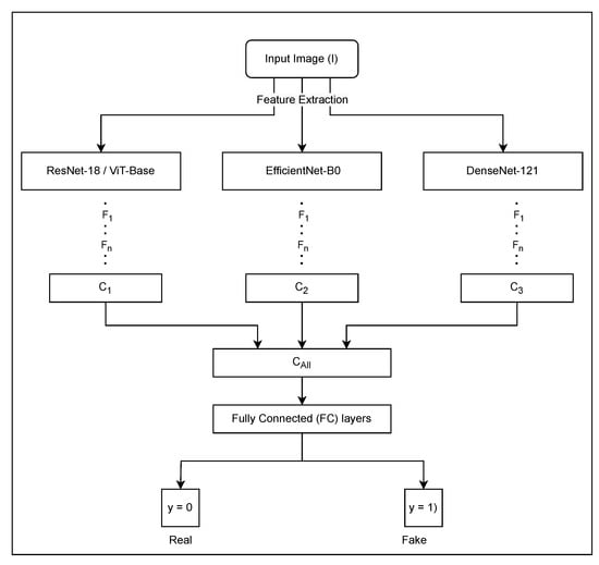 This illustration combines ResNet-18, ViT-Base, EfficientNet-B0, and DenseNet-121. It features fully connected layers for classification, showing the image input flow, feature extraction stages, and final classification decisions for real or fake.