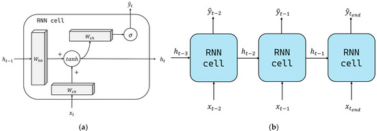Time-series data are characterized by the dependency of the current state on its previous states. To effectively process such sequential data, the recurrent neural network (RNN) architecture was introduced in [30]. Unlike conventional feedforward neural networks, RNNs maintain and reuse information from previous time steps through hidden layers, enabling the learning of continuous patterns over time, as seen in Figure 1. This capability has led to their wide application in various time-series analysis tasks, including natural language processing, stock market prediction and human behavior analysis.