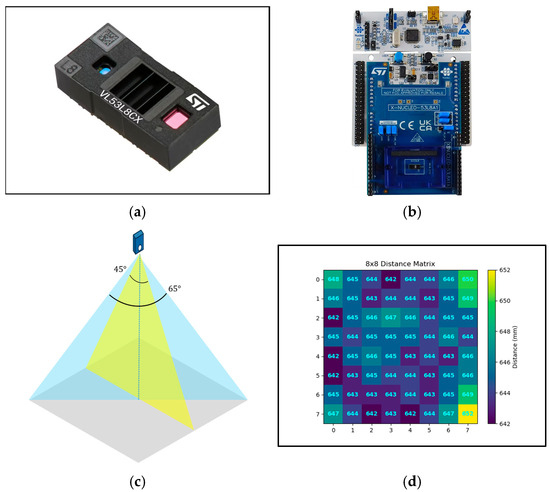 ToF sensor model and visualization of field of view (FoV) performance and acquisition of data: (a) ToF sensor model VL53L8CX; (b) ToF sensor evaluation board P-NUCLEO-53L8A1; (c) Illustration of FoV; (d) Data plot obtained from ToF sensor.