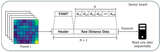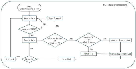 To ensure data quality, the noise detection and removal process is implemented, as shown in Figure 5. The sensor board includes the header string “START” at the beginning of each data packet to indicate the start of a new frame. The PC uses this marker to verify whether the complete set of 64 distance values corresponding to the 8 × 8 array is present. Any value marked as “X” (indicating missing reflections) is replaced with zero. If the frame contains invalid or incomplete data like “X1000”, it is discarded to maintain the integrity of the dataset. This process helps minimize noise and ensures that the neural network is trained with reliable and high-quality data.