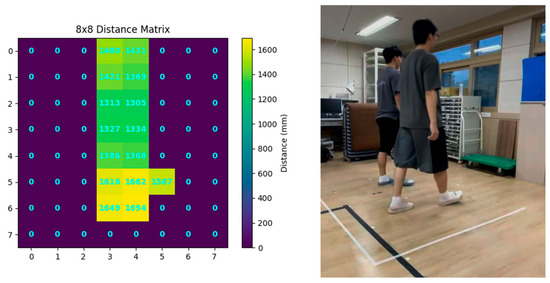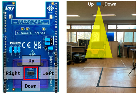 For data collection, the VL53L8CX ToF sensor is mounted on the ceiling at a height of 2.45 m, as shown in Figure 6. The sensor operates at a sampling rate of 15 frames per second (fps) and is configured to record continuous 8 × 8 array distance data as the person passes through its detection area within the FoV. Each data measurement takes about 3–4 s, and the size of the sequence data follows a distribution of about 90–120 frames, with an average size of 105 frames. The experimental environment is designed to allow individuals to naturally walk across the sensor’s FoV, and data are collected for both leftward and rightward movement directions within the detection zone. To maintain consistency regardless of sensor orientation, movements from left to right are labeled as “rightward” and those from right to left as “leftward”. These direction-based labels are used to train the LSTM model for classifying movement direction.