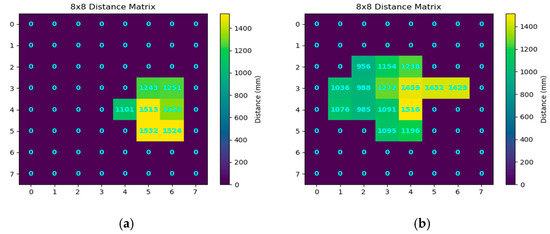 To achieve this, the system first measures the average distance to the floor during an initialization phase. This reference distance, , is calculated using the central 4 × 4 region of the array to efficiently calculate the vertical distance between the sensor and the floor. Subsequently, each measured frame is converted into a relative height map by subtracting the current array from the floor reference: