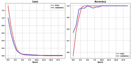Here, is the number of classes; is the one-hot encoded true label; and is the predicted probability for each class. The model is trained with a batch size of 16 and for 20 epochs, using an 80:20 split between the training and validation datasets.
