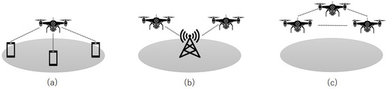UAVs offer significant potential for wireless communication applications [5,6,7,8]. In general, wireless interfaces are compatible with various types of UAVs and can operate on both unlicensed Wi-Fi and licensed cellular frequency bands. Equipping UAVs with wireless communication capabilities paves the way for a wide range of new application domains, owing to the nature of technical enablers, e.g., channel modeling for aerial networks [6] and edge AI [9]. Within these domains, UAVs can typically assume one of three primary communication roles, as illustrated in Figure 1: (a) Aerial base stations (or access points)—UAVs can be deployed to provide wireless networking and communication services in specific geographic areas [10]. (b) UAVs as UE (user equipment) nodes—UAVs can utilize existing infrastructure (such as cellular networks or Wi-Fi) to communicate with each other or with ground-based devices [11]. (c) Aerial networks: UAVs can form an aerial network for specific applications, e.g., extending the coverage and enhancing the reliability of existing wireless networks [12], sensor network aggregators [13], post-disaster surveillance [14], or even a sensor network itself for localization purpose of ground-based wireless emitters [15]. Not only restricted to theoretical works, the practicality of UAV-based networks was also partially evaluated in field experiments [9,16,17].