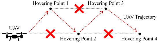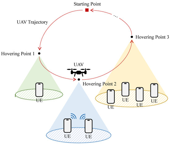 The UAV is assumed to collect data from the UEs when hovering, and there is no data transmission between the UAV and the UEs during flight. This assumption was made due to the challenges in maintaining stable and efficient data collection from multiple UEs. In related research where data is collected from a single UE at one time, it is relatively simple to establish and maintain the communication link between the UAV and the UE. However, when multiple UEs are involved, the movement of the UAV causes frequent changes in coverage area, leading to intermittent and potentially inefficient data collection. Therefore, this assumption allows us to simplify the system and ensure more reliable communication between the UAV and multiple UEs.