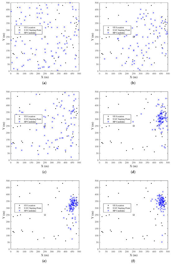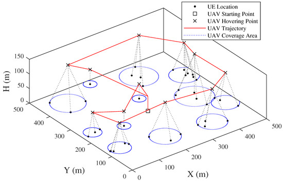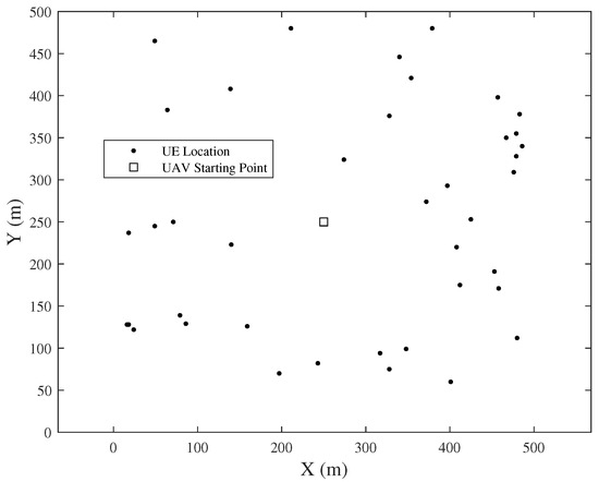 For simulation, a m flat urban area is assumed as the simulation environment. As shown in Figure 4, M UEs are randomly distributed in this area. The starting point of the UAV is set in the center of the area as , and the location of the UAV at time t is assumed as , while the location of the -UE is assumed as . Note that for simplicity, the UEs are assumed not to change their location.