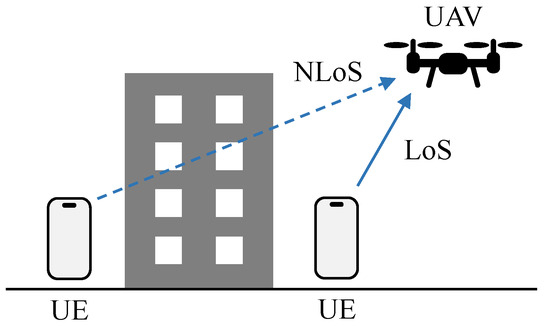 We adopt the 2.4 GHz band for data transmission, because it can be easily integrated with the hardware of UEs nowadays. For simplicity, the shape of the buildings is ignored. Thus, the data transmission model between the UAV and the UEs is defined with the possibilities of Line-of-Sight (LoS) and Non-Line-of-Sight (NLoS) propagation. As shown in Figure 5, LoS propagation occurs only when there is no obstacle between the UAV and the UE.
