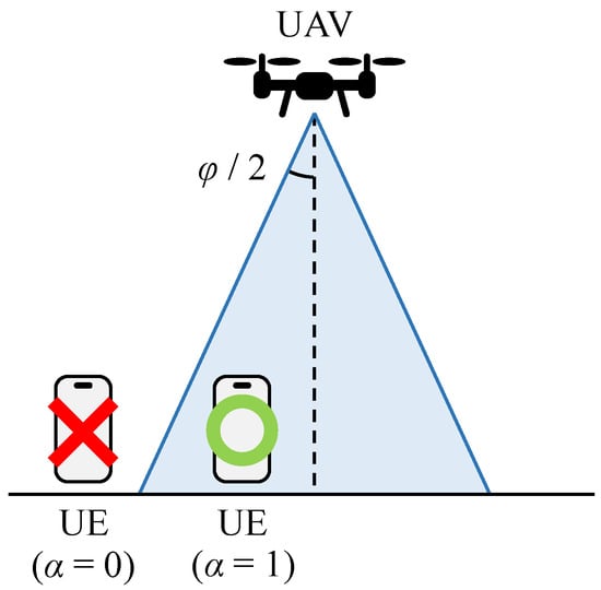 where and respectively denote the transmit power of the m-UE and the noise power at the UAV’s receiver, B is the system bandwidth, and is an indicator decided by the connection status between the UAV and m-UE as depicted in Figure 6, which is defined as below: