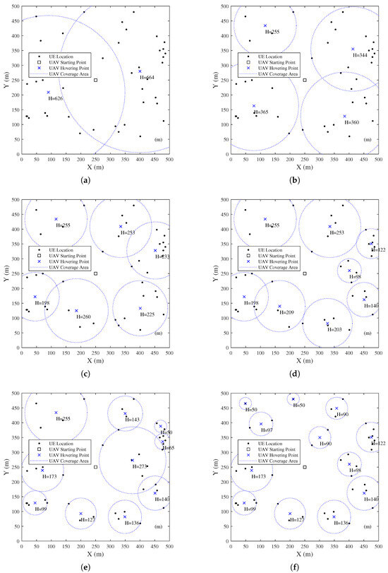 According to the definition of the LSCP, the problem can be described as searching for the minimum number of hovering points that enable the coverage of all UEs in a certain area. The coverage radius of the facility is defined as the maximum coverage radius of the UAV, which is 62.132 m, based on the limitation of the UAV’s flight altitude in this article.