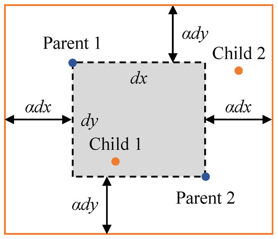 Blend crossover (BLX-) [38] is adopted for crossover, with a crossover rate of 0.9. As shown in Figure 8, the coordinates of child individuals are generated in the area decided by the coordinates of parent individuals and the parameter . If we assume the coordinates of parent individuals are (,), (,), the coordinates of child individuals (,), (,) will be generated in the rectangular area created by points A, B, C, and D as follows: