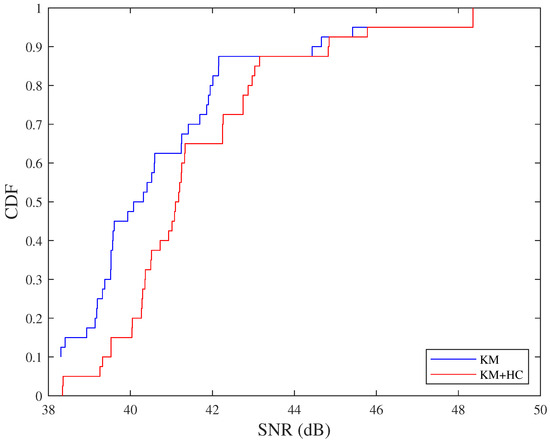 The placement of hovering points by sequenced K-means clustering is shown in Figure 11, where the blue and red dotted circles respectively indicate the coverage area before and after adopting the hill climbing algorithm. In this case, 12 is the smallest k that satisfies the flight altitude limitation. The cumulative distribution function (CDF) of the SNR before and after adopting the hill climbing algorithm is shown in Figure 12. From Figure 12, we can see that the hill climbing algorithm successfully optimized the UAV’s flight altitude, achieving larger SNRs.