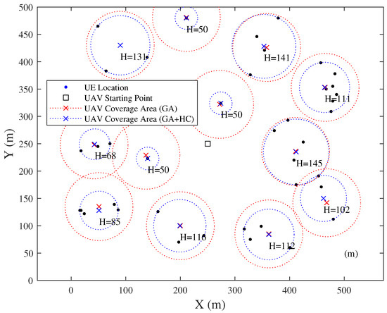 Then, the placement of hovering points by the GA is shown in Figure 13. The solution of the LSCP with the maximum flight height of 150 m, which is shown by the red dotted circles, is first obtained. And then, the hill climbing algorithm is adopted to optimize the UAV’s flight altitude below 150 m, which is shown by the blue dotted circles.