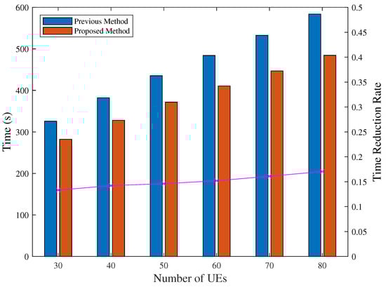 Completion time with varying numbers of UEs. Purple line shows the time reduction rate.