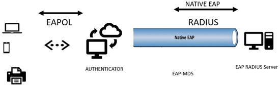 The Extensible Authentication Protocol-Message Digest 5 (EAP-MD5) is an authentication protocol that uses the MD5 hash function to validate the user. This is an implementation of EAP where the client sends a hash of the password to the server, where the validity of the hash is checked (Figure 2). Although it provides basic authentication, it has significant security weaknesses, as MD5 is considered a weak cryptographic algorithm and vulnerable to collision attacks [16].